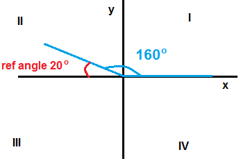 Example 1: Show the angle 160° in standard position, along with its reference angle. Also label the quadrants.